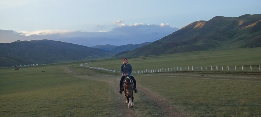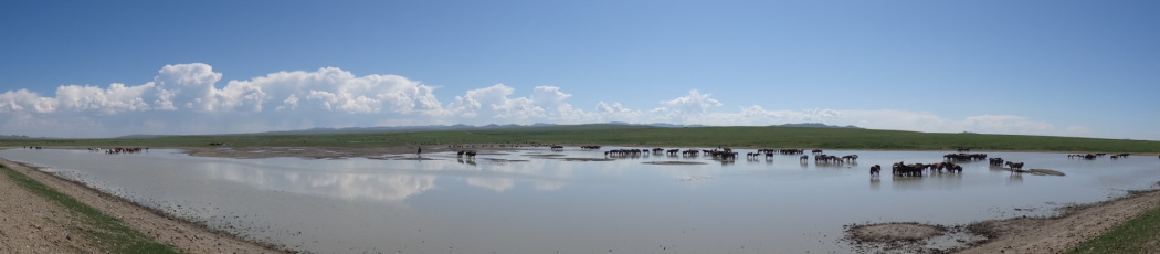 Die Steppe, unendliche Weiten. Auf unserem viertägigen Trip mit dem Jeep werden wir auf mehr Pferde als Menschen treffen. Ab und an kann ich in weiter Ferne die Umrisse vereinzelnter Jurten erahnen.