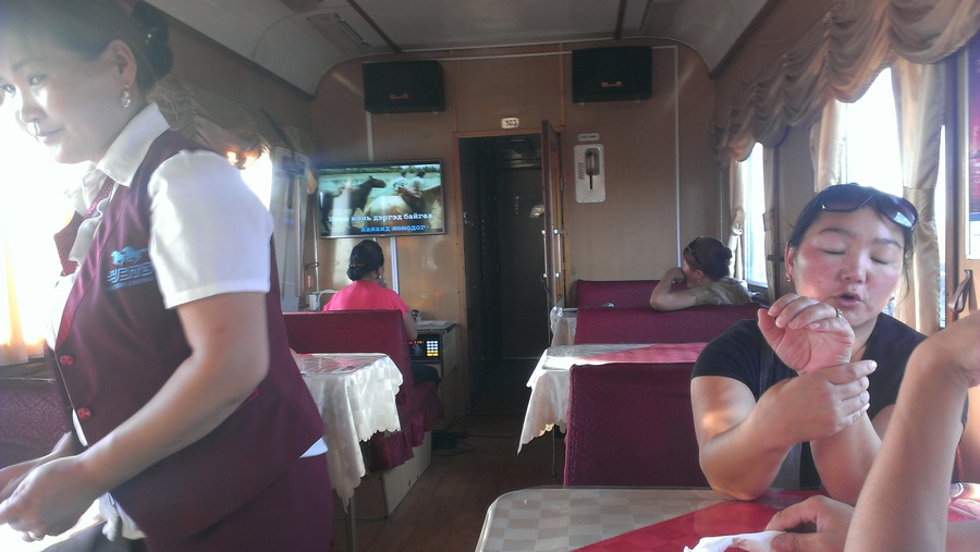 angeworfen worden. Immer mehr Mongolen strömen in den Speisewagen. Kein einziger Touri zu sehen. Wir nehmen noch einen letzten Schluck von unserem Bier und wollen die Plätze für die neuen Gäste