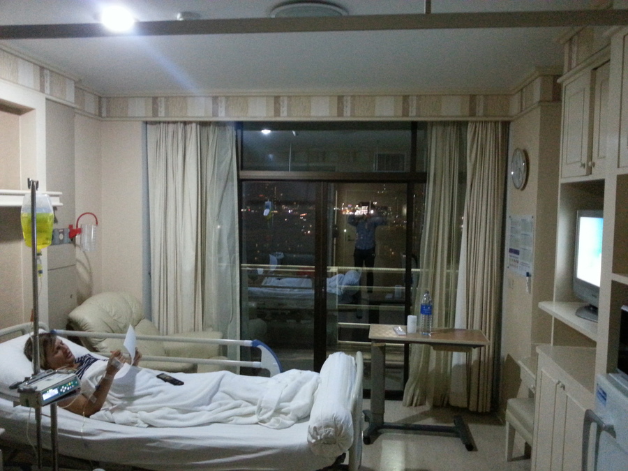 Nur ein paar Tage später, erwachte ich auf meiner steinharten Pritsche schweißnaß und dennoch bibbernd. Ein Blick aufs Fieberthermometer gab die Gewissheit. 39,5 Fieber. Im Krankenhaus angekommen stieg die Temperatur stetig weiter über die 40 Gradmarke. Zwischen den Schüttelfrostkrampfattacken, verfiel ich in einen fiebrigen Dämmerzustand mit Wahnvorstellungen. Wahrscheinlich das beste, sonst hätte ich noch gemerkt, dass die Krankenschwestern beim Infusionenlegen nur zu 80 Prozent Handschuhe trugen, mein Bettlaken in fünf Tagen nicht gewechselt wurde, ich die ersten Tage keine Decke gestellt bekam, mein Infusionsständer sich nicht bewegen ließ und Alex den Infusionsbeutel jede halbe Stunde an der mit blutbeschmierten Toilettenkabine auf dem Gang für mich halten musste, da ich durch den wilden Wechsel der Medikamente dauerhaft Diarrhoe und Übelkeit bekommen hatte. Vielleicht hätten mich auch die Blicke der anderen Patienten genervt, die mich, während ich laut schreiend meine Galle ins dreckige Waschbecken herausschleuderte, durch eine Glasscheibe zum Flur, interessiert anstarten. Wahrscheinlich hätte ich auch sonst den vertrockneten Gekko in meinem Zimmer entdeckt, der dort wohl schon vor einer Weile verstarb.